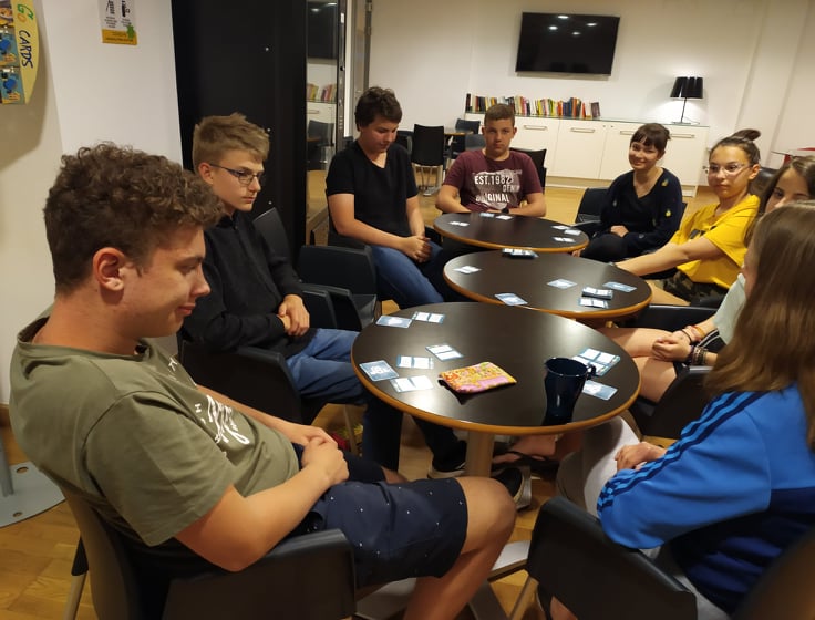 Esténként a társalgóban viháncoló tinik gyűlnek össze, projektmunkán dolgozni, társasjátékozni, kártyázni... , ezért egyáltalán nem bánjuk, ha a szeszélyes időjárás nem enged ki minket a szabadba! A nemzetközi vegyestársasághoz gyakran csatlakoznak a csoportok kísérői, akiket már nem is tanárként, hanem szinte lakótársakként, barátokként tartunk számon :-)